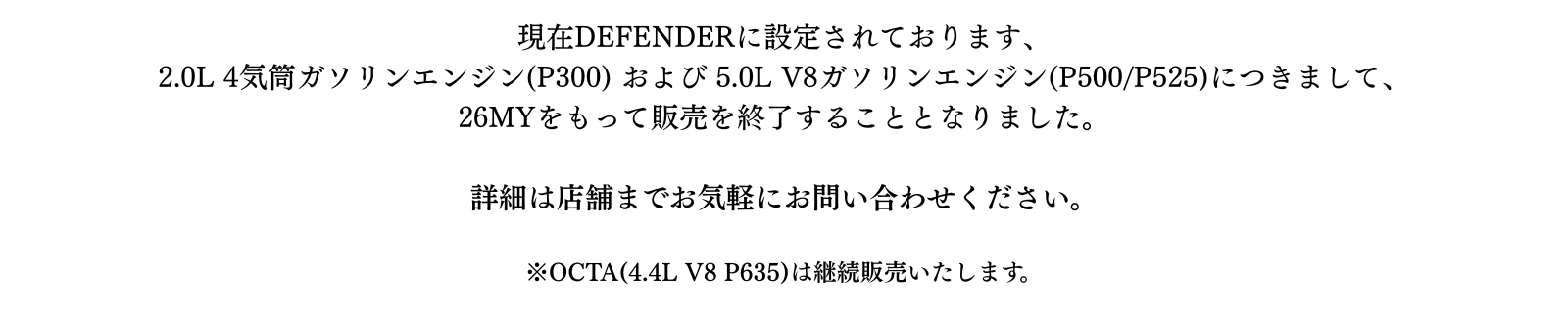 『DEFENDERガソリンモデル販売終了のご案内』